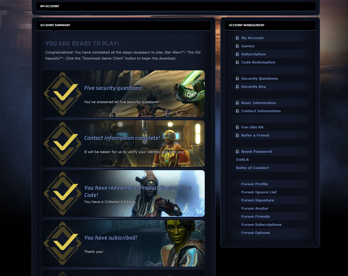 All of these can be completed at the “My Account” page on swtor.com. Be warned that it seems a lot of people did not read the instructions when they were setting up their account and now a lot of them are trying to log into their account and do the steps above. If you are greeted by a page that asks politely to wait until you log in, just wait for a few minutes and you will be able to log in. I tried it and it really is about a one minute wait.