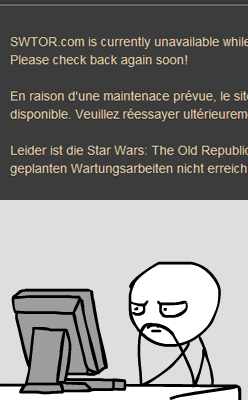 SWTOR had unscheduled maintenance downtime twice in two days after patch 1.3 got deployed. The reaction from the community was not too favorable, especially by the Australian players who were hit by the downtime during their prime time gaming hours. In fact, the reaction could only be described by the animated gif above. Me, I got to go out a bit and actually do some work (:O) while the game was down.