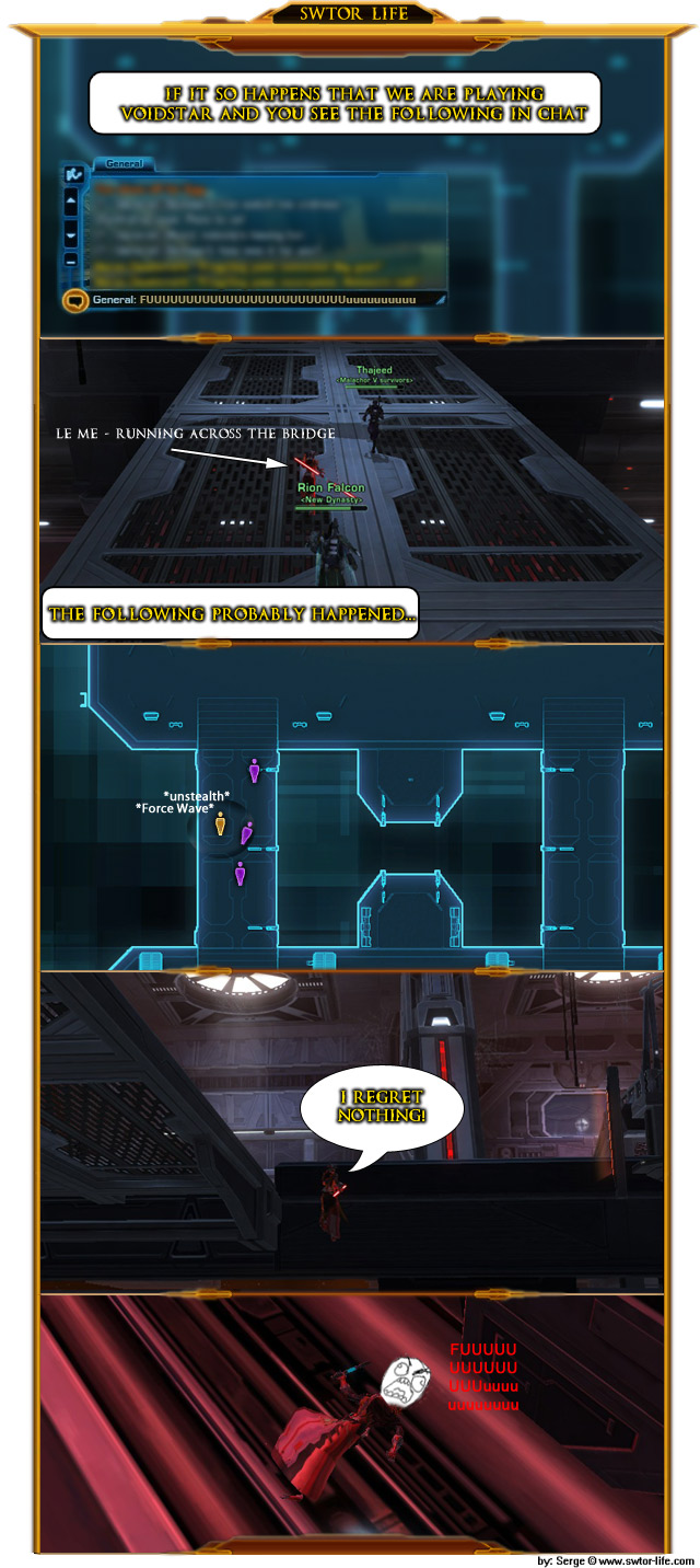 I wanted to talk about Voidstar bridges ever since the first time I played that warzone. I always thought that is brilliant level design; to put a huge canyon people can fall into (or be pushed into) while PvP-ing. I had my share of doing this to the opposition, but it doesn’t get easier when you are the victim of this move. It is ALWAYS frustrating, especially during those 2 seconds while you fall. What is your most frustrating Warzone moment?