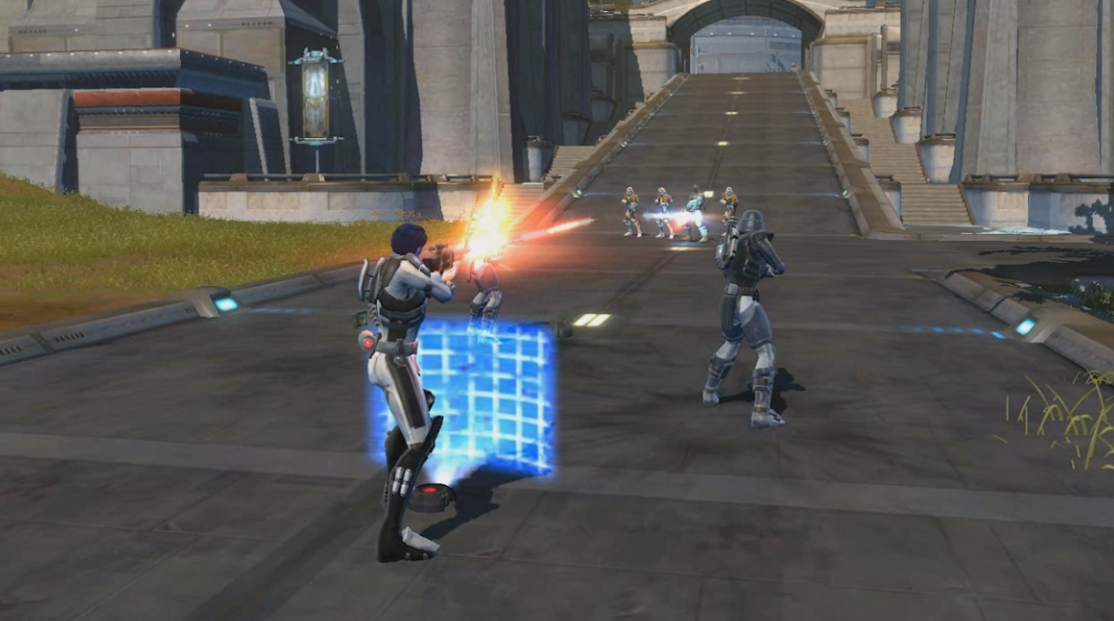 The last skill I managed to get was a portable cover skill. It is a kind of an energy field that you place in front of you and than you can use your in-cover skills and get some damage reduction. If I remember correctly the portable cover only provides damage mitigation (something like 20%) and if you really need cover you would be better off finding a true rock or a wall to duck behind. Portable cover is basically the skill you want to use when you are in an area with no cover opportunities (I came across these in flashpoints and group quest areas) and that require you to plan your attacks more carefully and using skills that are only available in cover mode.