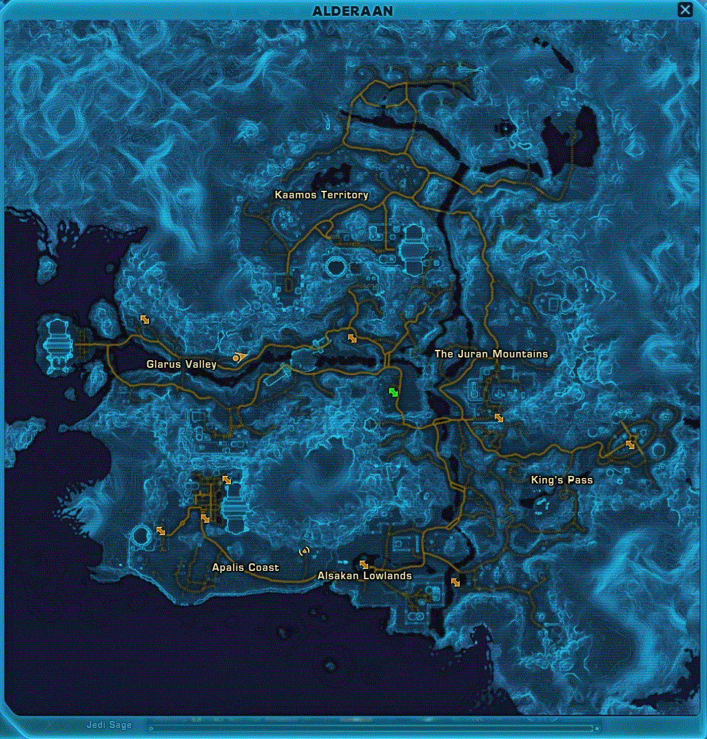As a Republic player, when you arrive on Alderaan, you are landing in the Pallista Spaceport. Unlike many planets you will visit, you won’t need to take a shuttle to the surface.  You land in the Apalis Coast region on the southwestern corner of the map. It is also the headquarters for house Organa. The quest lines seem to take you counter clockwise around the map to the northwest corner.