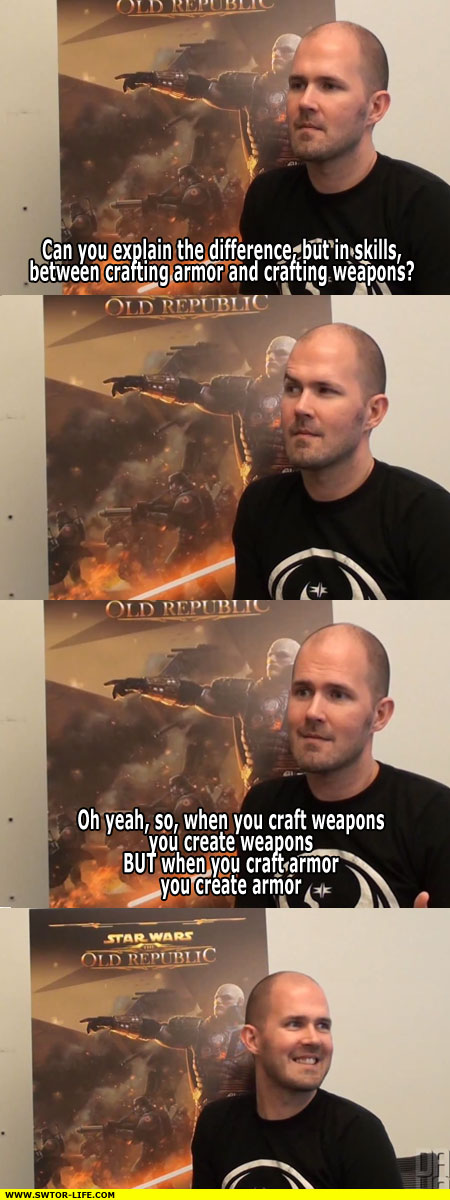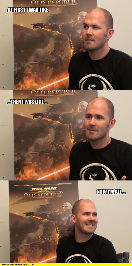 Following last Friday’s update that focused on Crew Skills crafting system, Darth Hater released an interview with Lead Writer for The Old Republic, Daniel Erickson. During this, otherwise informational, interview it just so happened that a question was asked that didn’t make much sense. Did that stop Daniel? Watch the video and see for yourself: