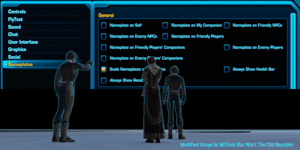 Like FlyText, I opt to have them all off. How many times have you run into a situation where a character approaches yours in a cantina and addresses your character by name? Obviously, it a faux pas on the part of the player. They saw the name floating above you and said it. If all RPers turned off their nameplates, in-game life would be more like real life where people ask you what your name is before engaging you in lengthy conversation about the best way to remove Minocs from a landing strut. I think it’s a good practice to keep the nameplates off if for nothing more than to add a deeper immersion and to keep you from being distracted by names like “Lord Poopiepants.”