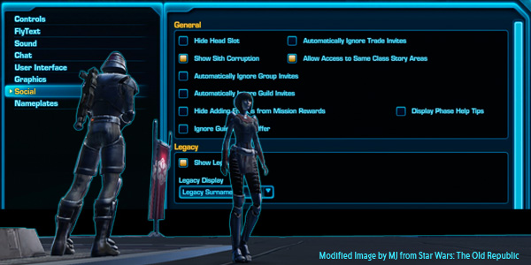 Show Legacy Bar — This will be a preference for the higher level RPers to seriously consider. Do all your characters share the same last name or just the same legacy? If you’re like me and have characters spanning multiple alignments, backgrounds and species, you’ll probably want to reserve your Legacy as a simple sub-head or just leave it invisible. It’s just nice to know there are options to keep those of us with Twi’lek Sith and human troopers happy.