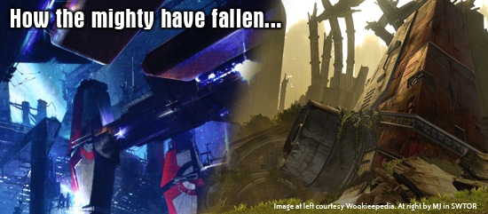 So, fully armed and geared up with my trusty sidekick, a smuggler I call “Mr. Funny” because of his penchant for naming inanimate objects (and if I hear one more time about his beloved “Torchy” I’m gonna blast him myself), I set out for the crash site. I wasn’t sure what to expect, but I was immediately stunned as we crested a ridge of upper city wreckage and saw her, the Endar Spire, surprisingly intact and still maintaining the familiar profile of a Hammerhead-class cruiser.