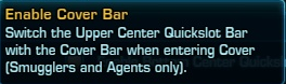 Cover bar is for Smugglers and Imperial Agents and is quite useful. What this does is change out skills that can only be used in cover and remove those that can only be used while out of cover. Just remember to check the skills to see which is which. It’s a great space and time saver.