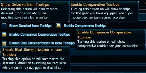 Tool tips should all be switched on. It just makes it so much easier changing up gear and rolling on flashpoint loot.