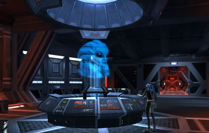 Sith Spaceship comm roomThere is a comm room existing in both videos with a huge hologram displaying device in the middle. I can’t remember if it had a huge role in KOTOR, but we can speculate it will be used in SWTOR based on the Sith ship footage displaying communication with a Twi’lek. Whether this will be some sort of quest entry are where you can enter flashpoint missions or just part of some quest line (perhaps battleground access?) remains to be seen. Space combat was announced at Comic Con and this ads another dimension to player ships. Will the player ships also house fighter craft you can take into Space Battle hotspots or will they, themselves, be the ships you take into combat? If that is so what happens when you get blown up? We’ll have to wait for PC Gamer magazine that has exclusive rights on revealing more information on Space combat.